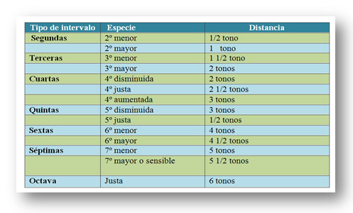 Los intervalos son simplemente las distancias entre las notas. El nombre que tendrá el intervalo dependerá de la distancia de los mismos, es decir semitonos. Pondremos la escala de Do mayor con su explicación.